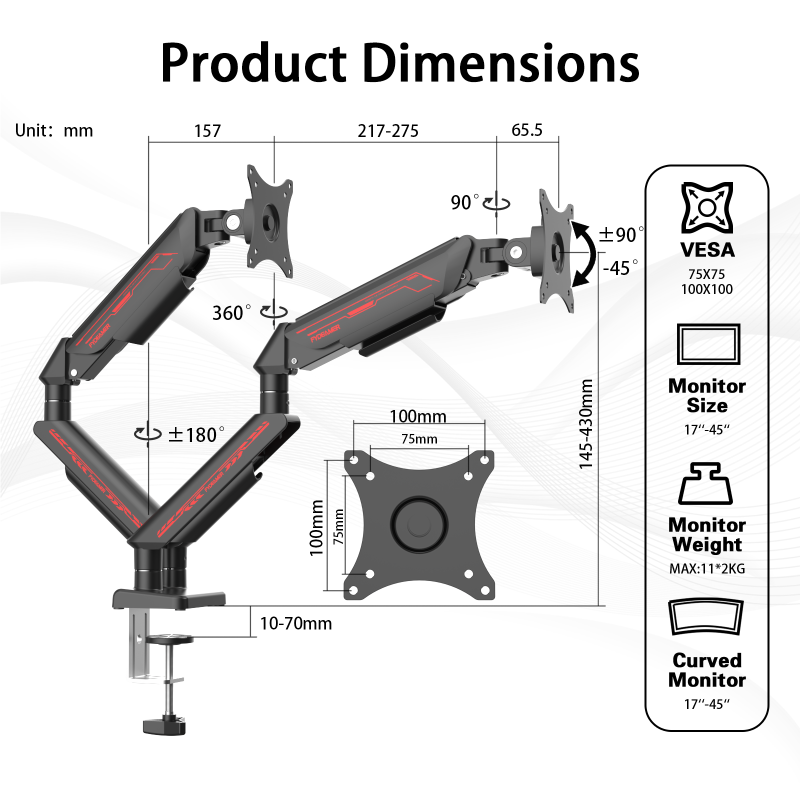 Say goodbye to messy cables! The built-in cable management system hides and organizes your monitor cables within the arms, maintaining a clean, professional look. This keeps your workspace neat, improving both appearance and accessibility.